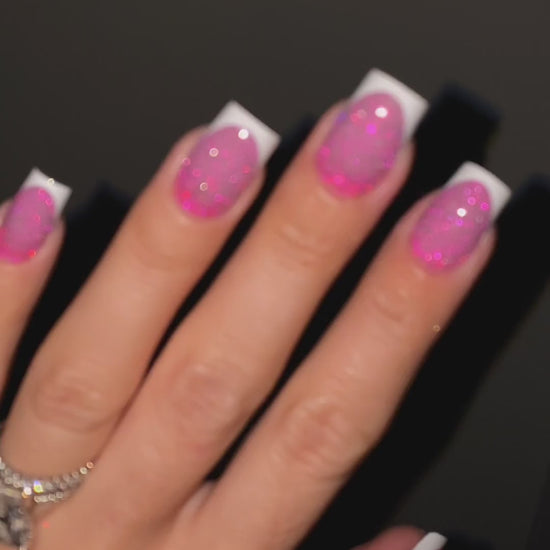Translucent pink base with reflective particles — subtle by day, dazzling by night.
