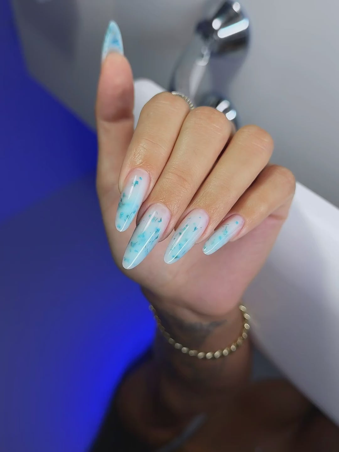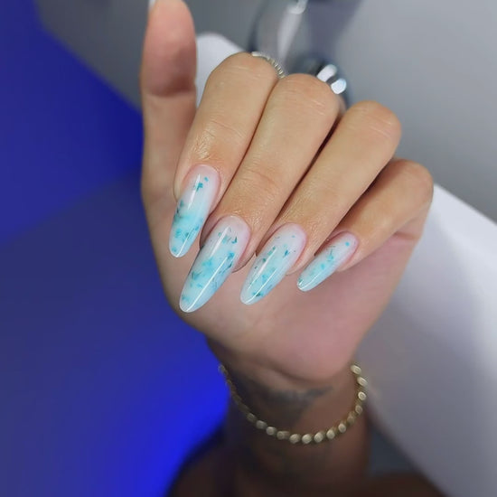 A milky sculpting gel infused with real dried flowers in soft blue tones, gently diffused through a translucent milk base.