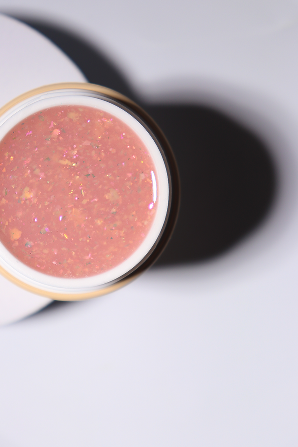 Party Nude is a luxurious camouflage builder gel enriched with ultra-fine Disco Flakes. These multidimensional shimmer particles create a magical radiance that appears and disappears depending on the viewing angle — a sophisticated sparkle that feels both playful and elegant.